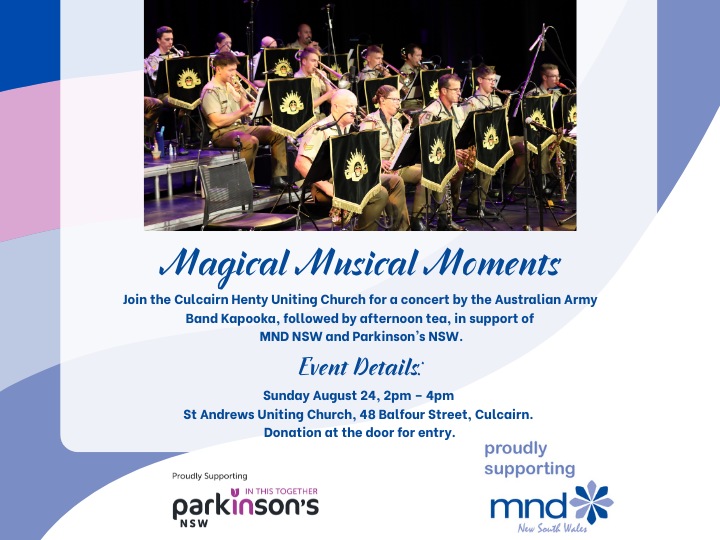 Join the Culcairn Henty Uniting Church for a live performance by the Australian Army Band Kapooka, followed by afternoon tea, to support people living with motor neurone disease and their families.