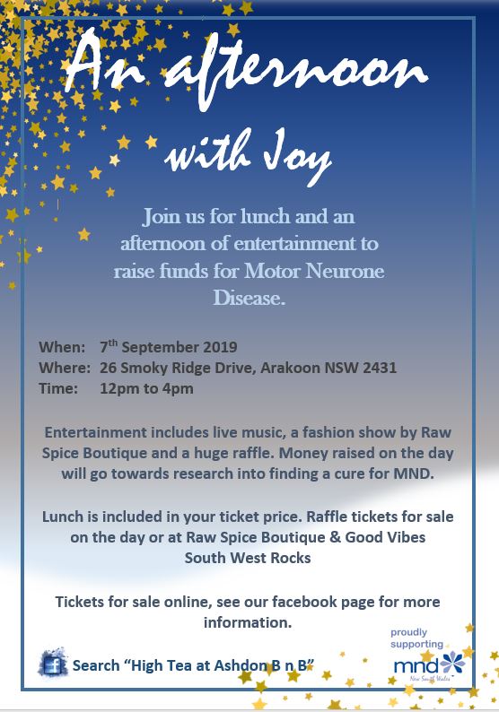 High Tea event for MND with live music, a fashion show by Raw Spice Boutique and raffles.