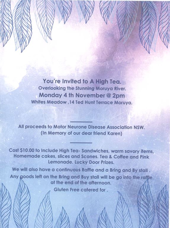 A High Tea overlooking the stunning Moruya River, with all proceeds to MND NSW. For information contact Zara White at
